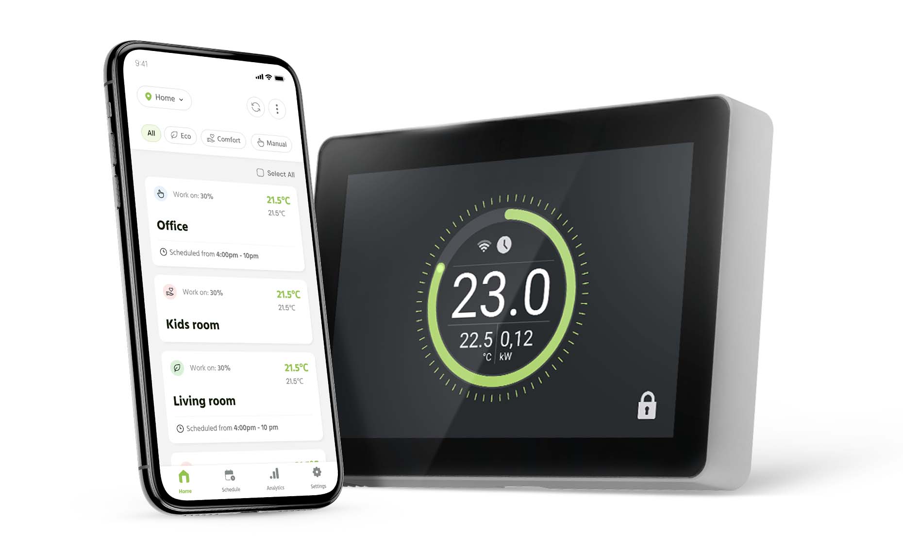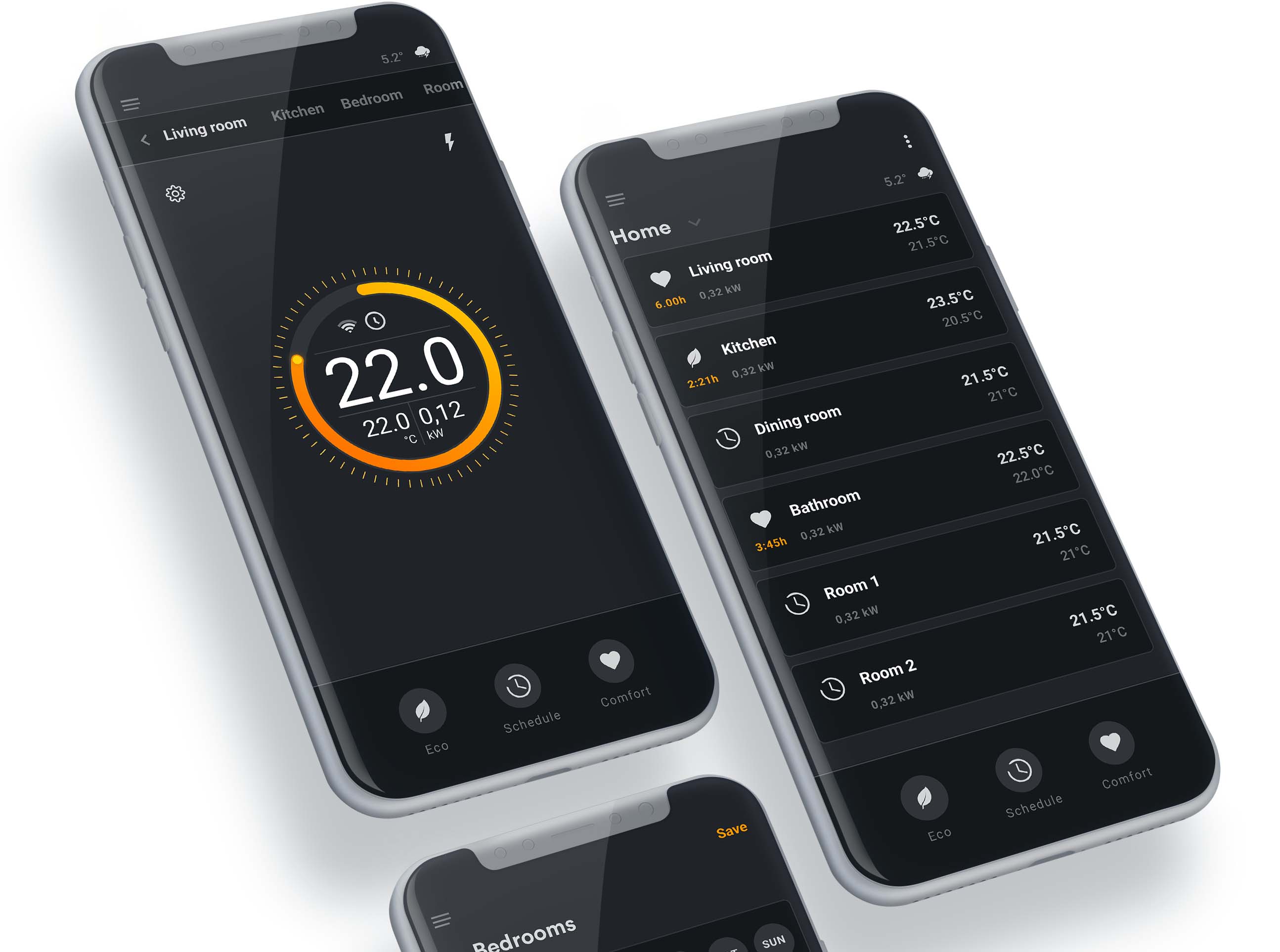 The app greatly facilitates heating optimization for all owners or managers of heating systems. It allows you to change settings for the entire heating system (apartment, house, multiple apartments...) or individual heating elements. With a single click, you can change heating modes (Eco, Comfort, Schedule), check the current power of your heating panels, turn heating on or off at the desired location(s), change all heating settings, and use the lock option to prevent children, curious visitors, or tenants from changing the settings. Management has never been easier!