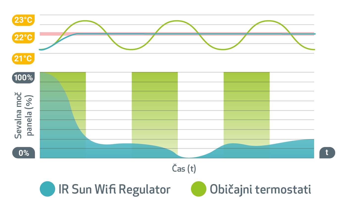 Continuous monitoring leads to the correct use of the IR heating system and contributes to more rational heating of your spaces. Our tests have shown that users of the IR Sun WiFi regulator learn the correct use of IR heating systems more quickly and easily and are much more satisfied with IR heating than users of classic thermostats.